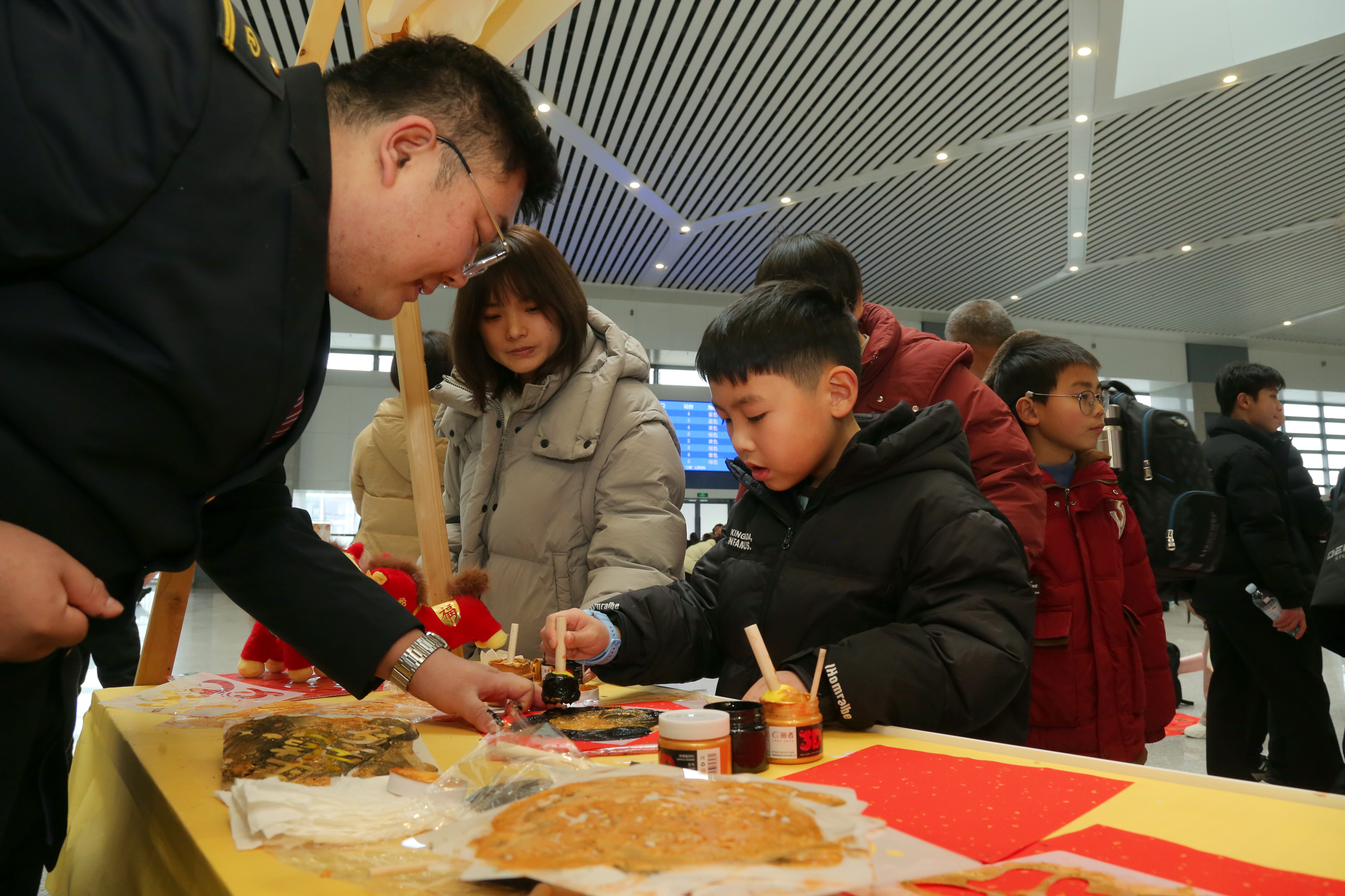 南阳东站在候车室里办起“文化市集”,把剪纸、年画、手工雕花等文化项目搬进了候车大厅,让返乡旅客在候车间隙体验民间艺术的鲜活魅力。