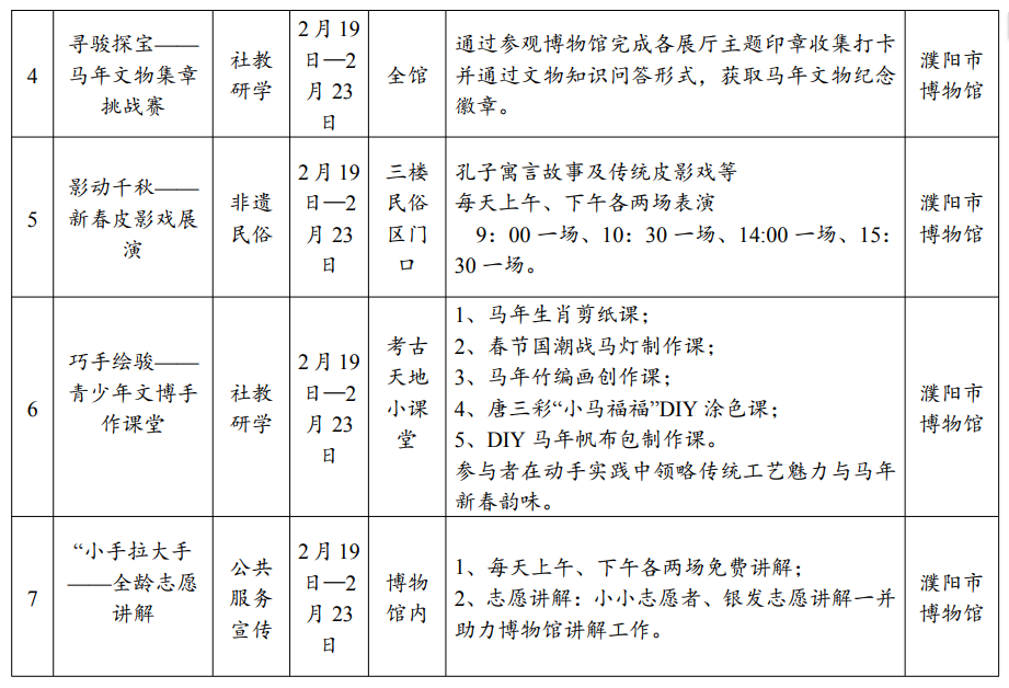 内容:拓印体验、马年文物集章、志愿讲解、文创集市等