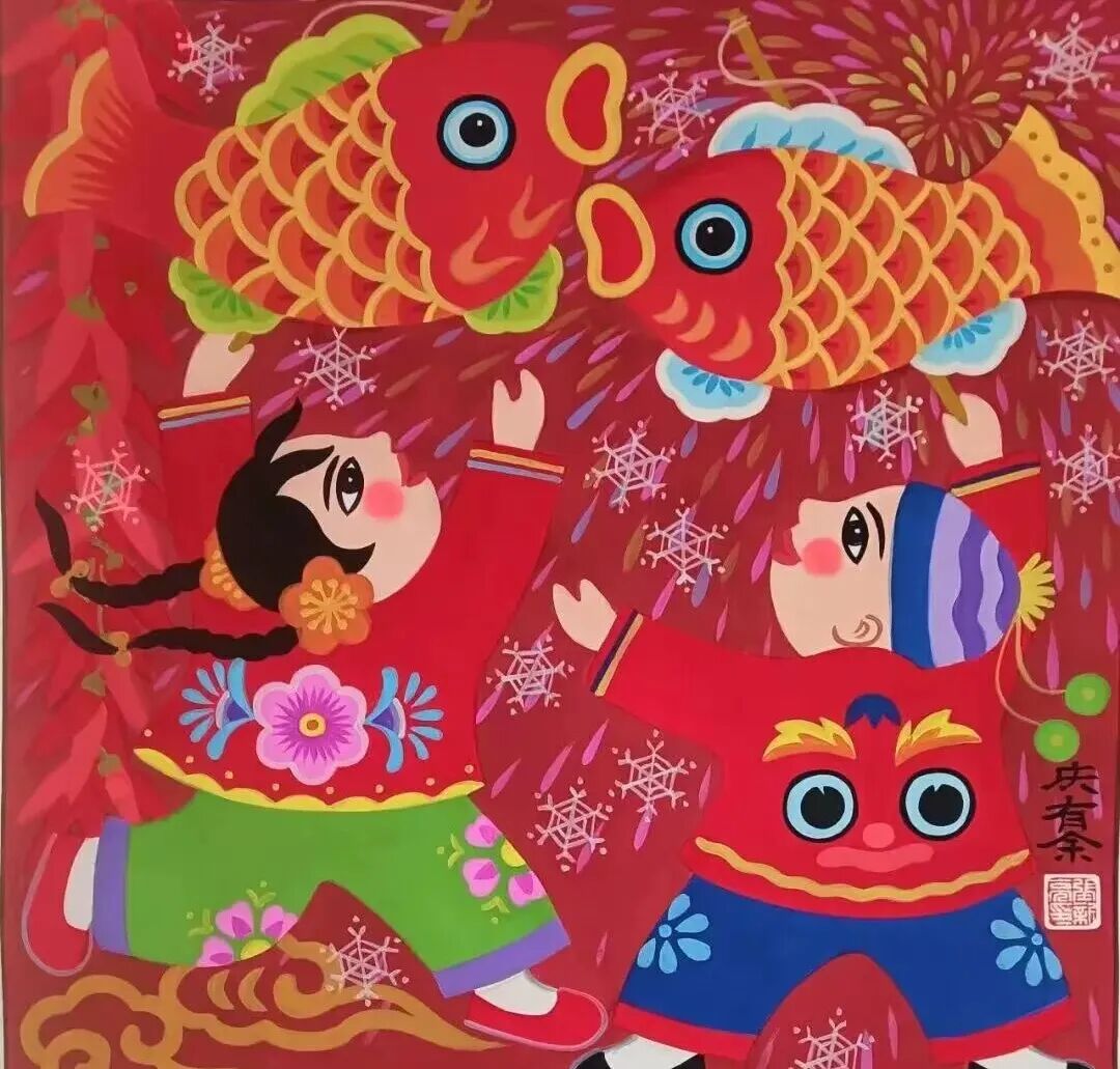 《庆余年》以夸张造型描绘两名孩童手提鱼灯嬉戏的场景。“鱼”的形象历来寓意“年年有余”,整幅作品传递出人们对美好生活的向往。