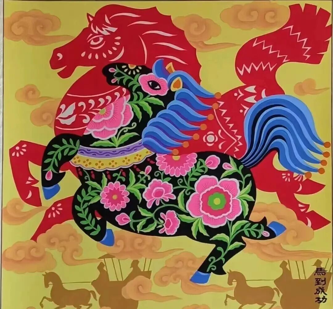 农民画家们以务农生活为创作源泉,创作出大量充满浓郁生活气息和乡土特色的农民画,例如这张《马到成功》,画面中心的两匹马分别呈现彩绘泥塑与剪纸风格,前后叠加有序,造型夸张生动,着力表现马的品格与精神,透出朴拙的趣味。