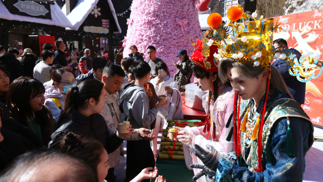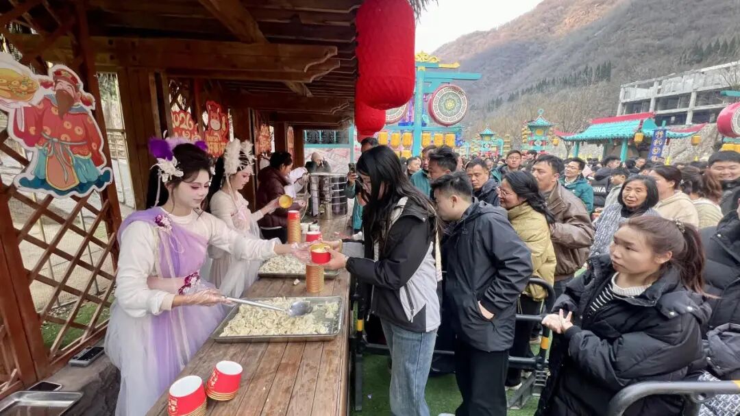 大年初一至初七,河南宝泉旅游区支起一口直径3米的“大地锅”,免费为游客煮新春福饺,并由“灶王爷”、“财神”现场派发;焦作云台山在大年初三免费派送千根甘蔗、万份发糕,寓意“芝麻开花节节高”;洛阳栾川竹海野生动物园打造百米“虎街”,特色美食免费品尝;濮阳市新春电影小镇则为游客准备了免费红枣银耳汤。