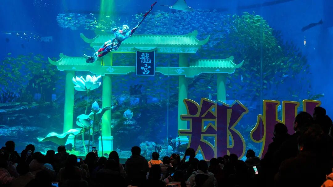 在郑州海昌海洋公园,8米深的水下,一场名为《水下刀马旦》的中原首秀惊艳亮相,令玻璃外游客惊叹连连。演员张春蕾每天完成8场演出,戏服浸湿后重量是陆地四五倍,加上铁枪和4斤铅块,她负重在身却依然从容,“虽然不能回家过年,但能让游客感受到传统文化的魅力,值了。”