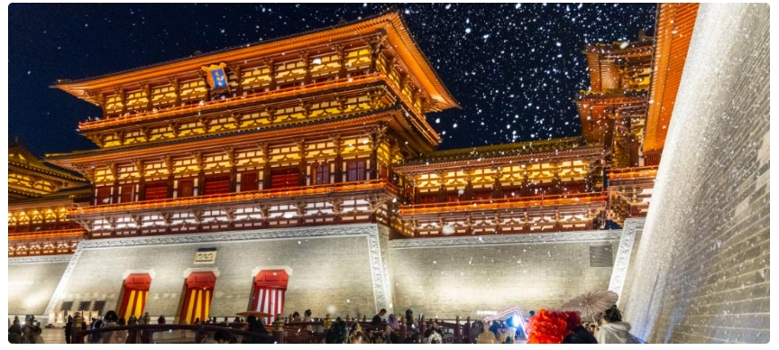 应天门遗址博物馆;2月15日至2月23日每晚19:00、20:00各一场,每场20分钟;应天门二层平台上演人工“降雪”,漫天“雪花”勾勒盛唐建筑,营造穿越千年的浪漫夜景。