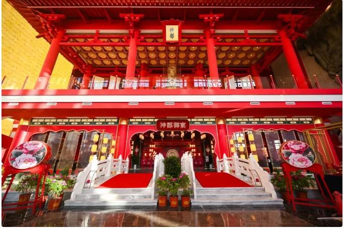 中央大殿复刻朝堂氛围,顶部七彩祥云层叠错落、光影交织、满溢祥瑞,唐三彩与牡丹文化交相辉映,千年风雅流转于飞檐斗拱间。