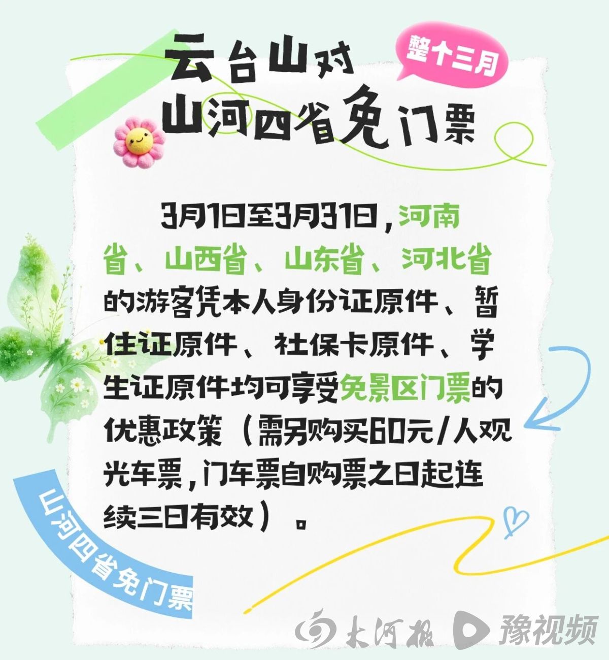 同日,河南焦作云台山景区也官宣了区域性优惠政策:3月1日至3月31日,面向河南、山西、山东、河北四省游客免门票。符合条件的游客凭本人身份证、暂住证、社保卡或学生证原件,即可享受政策。需特别说明的是,免票游客需另购60元/人的观光车票(景区交通必需),该门车票自购票之日起连续三日有效,方便游客深度游览。