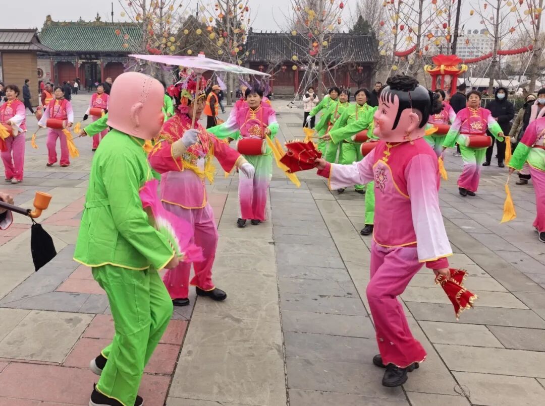 腰鼓队员身着鲜艳服饰,红绸翻飞、鼓点铿锵,气势磅礴震撼全场;秧歌队员手持彩扇,舞步欢快、笑容灿烂,将节日喜庆推向高潮。唐僧师徒、济公等经典民俗形象轮番互动,广场上游人如织,汇成一片欢乐的海洋。