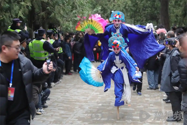 13时30分许,东后街社火队的出现将文治阁的气氛推向高潮。高跷队员在欢呼声中表演了前空翻、后空翻等高难度动作。压轴出场的则是耿晓孟与耿诺一父子联袂表演的《扑蝶》,两人动作协调一致,灵动传神,现场叫好声不断。