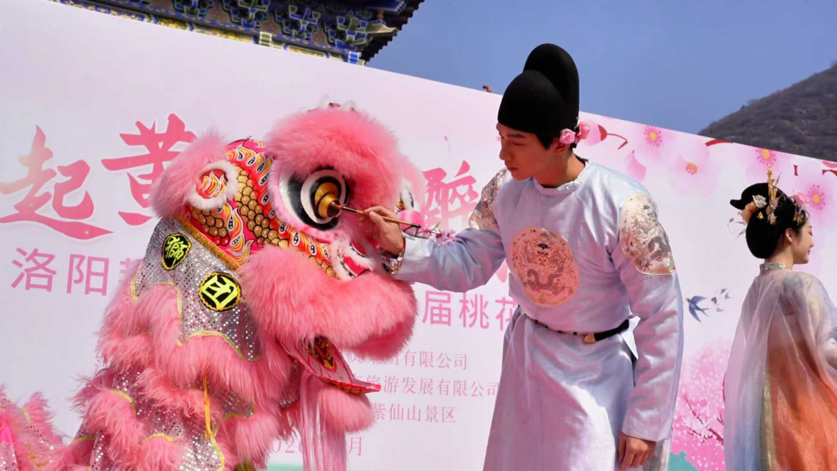 随着桃花节的开幕,五彩烟幕腾空而起,直冲云霄,与漫山遍野的桃花交相辉映,现场掌声雷动、欢呼不断。两位身着汉服、扮相仙气的“桃花仙君”翩然登台,为威武雄壮的瑞狮点睛。朱笔落,瑞狮醒!点睛完毕的瑞狮瞬间“苏醒”,摇头摆尾、活灵活现,向现场观众行礼致意,将吉祥如意的美好寓意传递给每一位观众。舞者们手持桃花枝,在乐曲中翩翩起舞,如诗如画,为开幕式画上圆满的句号。
