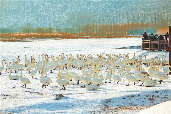 冬季,雪后的三门峡市后地天鹅湾,雪地鹅影,浪漫邂逅。摄影爱好者、游客纷纷前来打卡留影。刘涝慈 摄