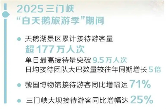 一组数据见证热度:天鹅湖景区累计接待游客量超177万人次,单日最高接待量突破9.5万人次,日均接待团队大巴数量较往年同期增长5倍;虢国博物馆旅游季期间接待游客同比增幅达71%;三门峡大坝接待游客同比增幅达25%。“到三门峡看天鹅”,已成为游客的冬日选择。