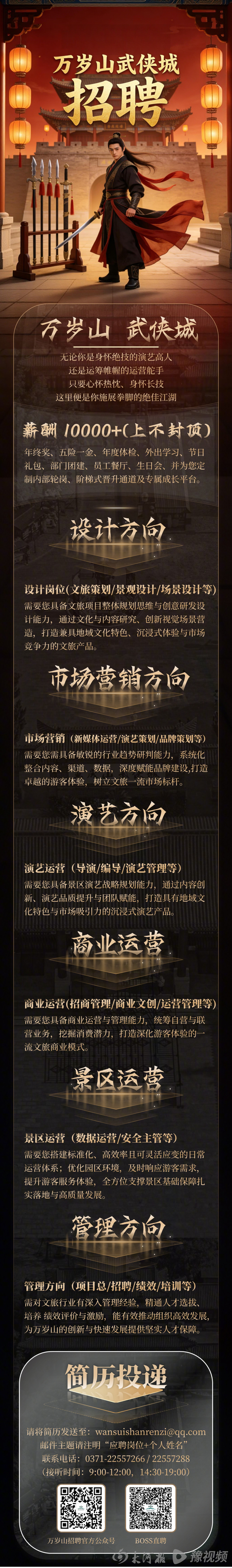 曾经凭借《王婆说媒》及沉浸式武侠演艺火爆出圈的万岁山,此次招聘堪称 “求贤若渴” 。记者梳理发现,本次招聘并非局限于普通一线人员,而是侧重于具有全局视野和规划能力的人才与专业舵手: