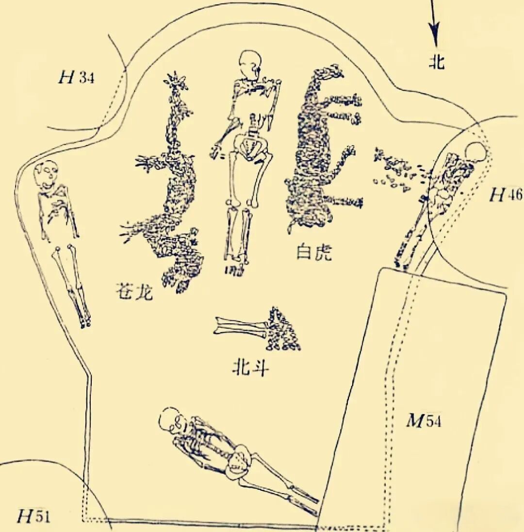 天文考古学者冯时认为,M45墓的蚌塑图实际上是一幅天文图案。墓主骨架东侧为蚌龙、西侧为蚌虎,正是后世“四象”中东方苍龙、西方白虎的原型,墓主脚下的三角形蚌塑和两根胫骨,象征北斗的斗魁和斗柄 。