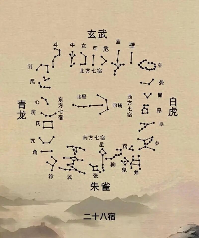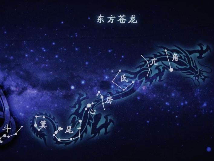 我国古代天文学家将黄赤道附近的星象划分为二十八宿,又按东南西北四个方位分为四组,产生“四象”:东方苍龙、西方白虎、南方朱雀、北方玄武。其中,东方七宿——角、亢、氐、房、心、尾、箕,连起来形似一条巨龙,古人称之为“苍龙”。