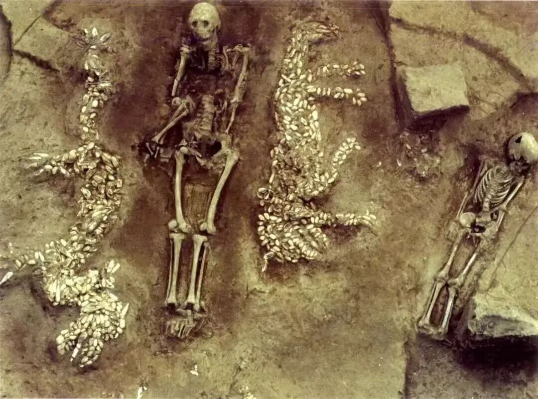 墓室正中是壮年男性墓主骨架,骨架左右两侧用蚌壳精心摆塑着龙虎图案。人骨右侧的龙昂首、曲颈、弓身、长尾,前爪扒、后爪蹬,状似腾飞,身长1.78米、高0.67米。人骨左侧的虎头朝北、背朝东,瞪目、张口、垂尾、行走状,身长1.39米、高0.63米,墓主脚下还发现蚌塑的梯形图案,旁边有两根人的胫骨。