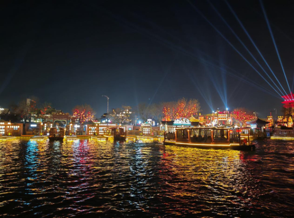 乘汴河游船,灯火映波,两岸仿宋建筑流光溢彩,水上实景演出移步易景,宛若置身《清明上河图》的活色生香,宋风雅韵尽在眼前。