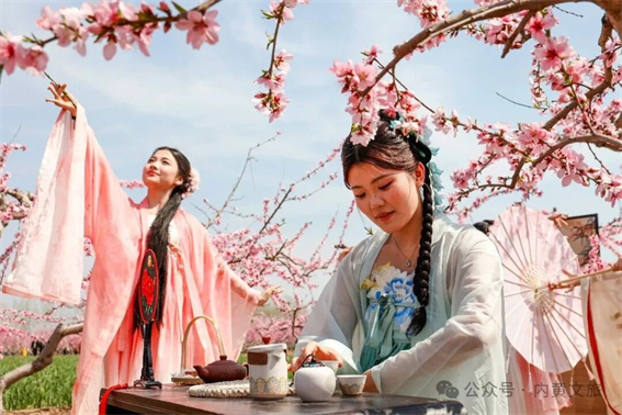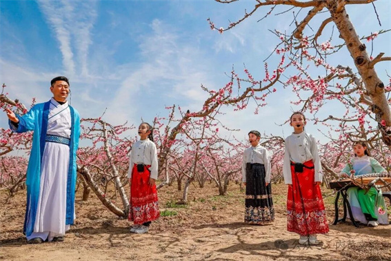 沉浸式文艺游园贯穿桃林深处。“桃花仙子”共舞《花神》,鼓乐迎宾点朱砂送福,“桃园三结义”情景再现,经典诵读与古筝雅韵相映成趣,桃花仙子仙子抚琴、烹茶、插花,营造“画中游”的唯美意境,吸引众多游客驻足打卡、互动留影。