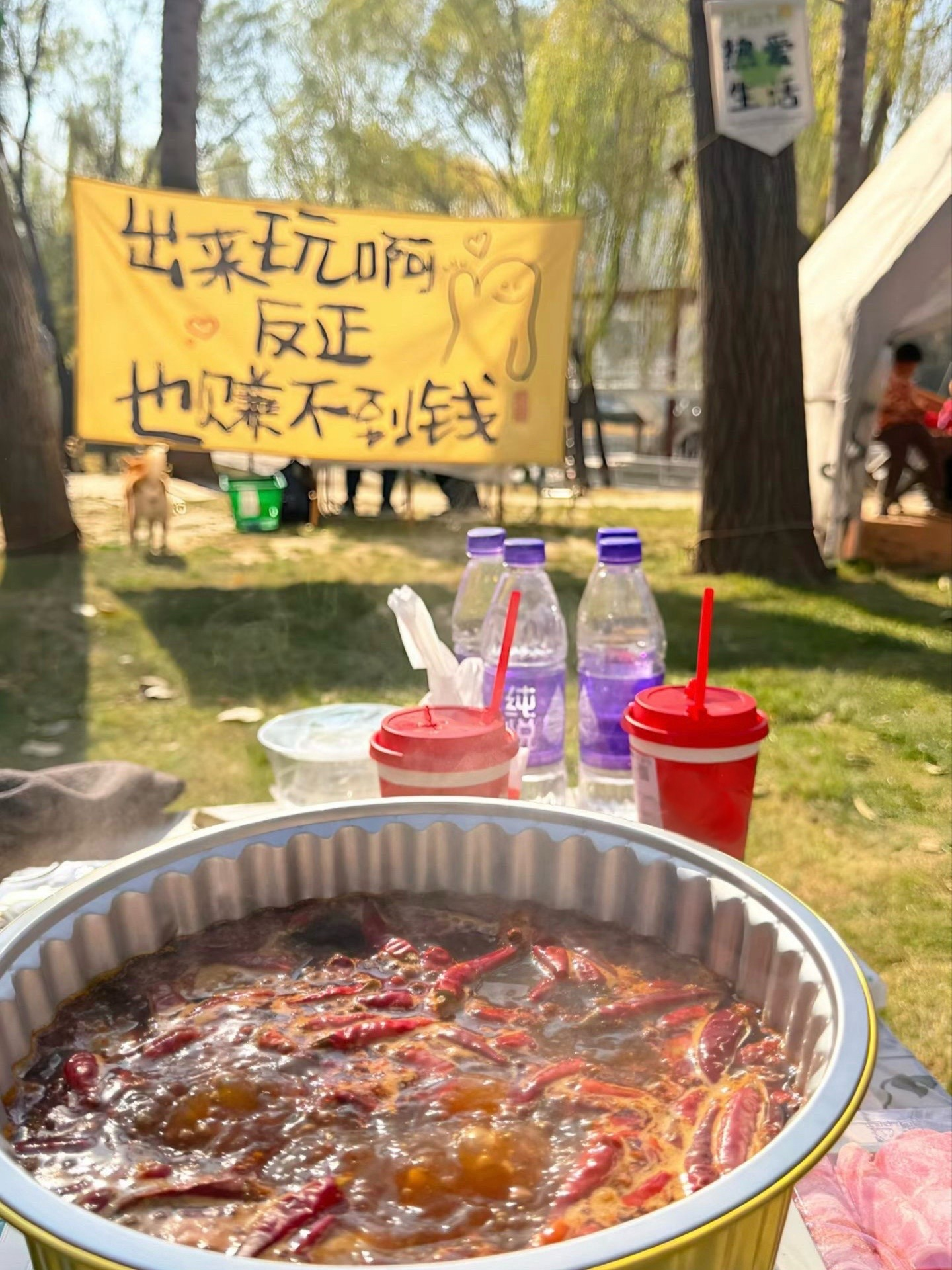 草木葱茏、春意正浓。草坪上帐篷错落有致,孩子们追逐嬉戏、笑声不断。卡式炉上火锅咕嘟作响,烤盘里食材滋滋冒油,香气随风飘散,展现出一幅和谐、欢乐的社区生活画卷。