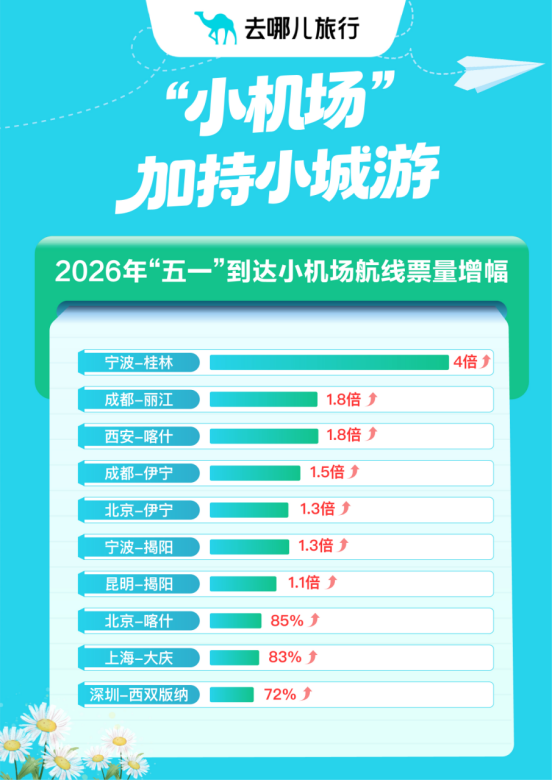 去哪儿旅行数据显示,五一飞往部分三线及以下城市“小机场”航线机票预订量增长超五成。例如,放春假的宁波飞往桂林机票预订量同比大增4倍,成都-丽江机票量同比增1.8倍,上海-大庆增83%,深圳-西双版纳增72%。拥有小机场的小城,吸引游客的半径显著扩大。