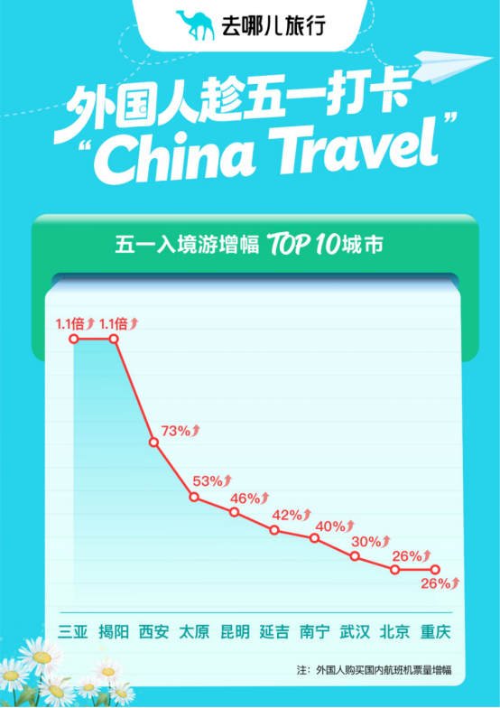 五一劳动节,也有不少外国人趁此机会来体验中国。去哪儿旅行数据显示,五一期间,最热门的国内入境游城市是上海、北京、广州、深圳。从增长情况来看,飞赴三亚、揭阳的外国游客增长1.1倍,增幅居首;飞赴西安增超7成,飞赴太原、常州、昆明、延吉、南宁、武汉增三成以上,飞赴北京、重庆、广州增超20%。
