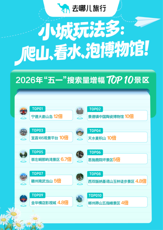 去哪儿旅行数据显示,2026年“五一”期间,一批小城景区热度攀升最快。如景德镇中国陶瓷博物馆搜索热度增加了10倍,崇左峒那屿湾搜索热度增长了7倍,恩施鹿院坪景区搜索热度增长了5倍。