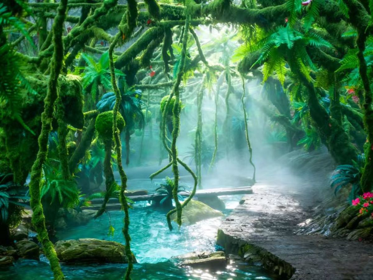 在绿野仙踪下方,打造出了令人眼前一亮的“微型热带雨林”奇观。巨大的棕榈树、芭蕉树,配合人工雾森系统,阳光透过层层叠叠的阔叶洒下来,光影斑驳。