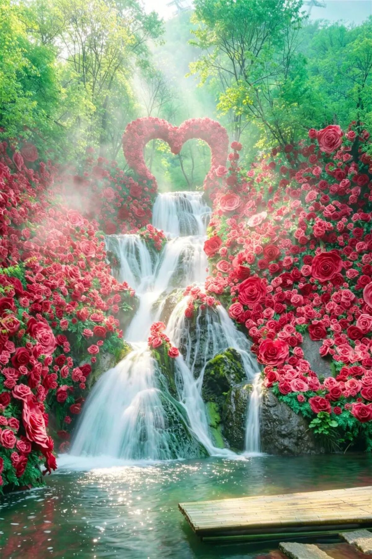 一座瀑布,从花海悬崖上倾泻而下,水雾里时常挂着一道不请自来的彩虹。这不是特效,是今年花海瀑布全新升级后的日常。悬崖边种满了玫瑰花,粉色红色交织,瀑布像从花海里“长”出来一样。