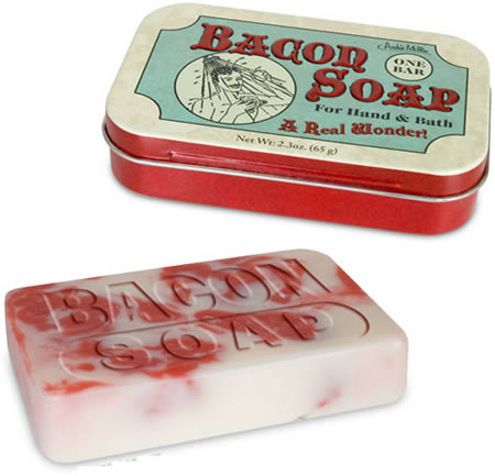 星期日的早晨阳光明媚,你从睡梦中醒来,闻到一股香喷喷的熏猪肉味道,香味却是从卫生间传来的……没错,这款肥皂的设计师从熏猪肉里提取了香精,并用其做成了无论是外观还是味道,都活生生地好似熏猪肉的肥皂!每块肥皂的上面都刻着“熏猪肉肥皂”的字样并装在铁皮罐头盒里。如果每个人都用这样的肥皂洗澡,岂不是大家身上都散发着熟肉的味道?
