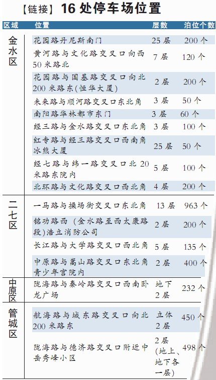 记者从郑州市城区综合交通管理办公室(市畅通办)获悉,郑州将在经三路、文化路、未来路等繁华路段新建16处停车场,以立体停车场为主。其中,金水区9处、二七区4处、中原区1处、管城区2处。