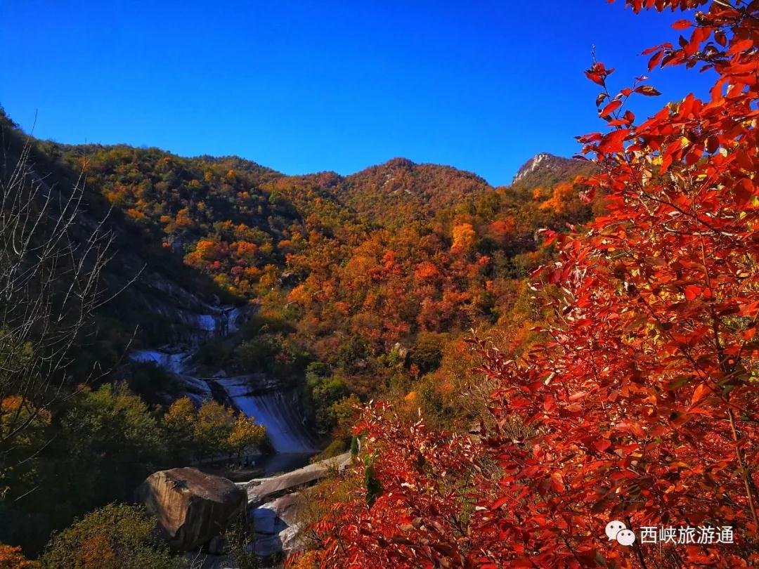 红色斑斓,流水潺潺,通透灵动。在这样一个秋高气爽的天气里,最适合在龙潭沟天然的山水景观里,徒步而行,登高望远,感受这五彩斑斓的秋天。