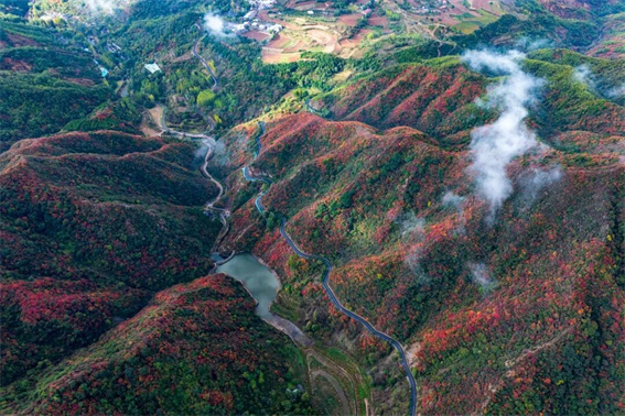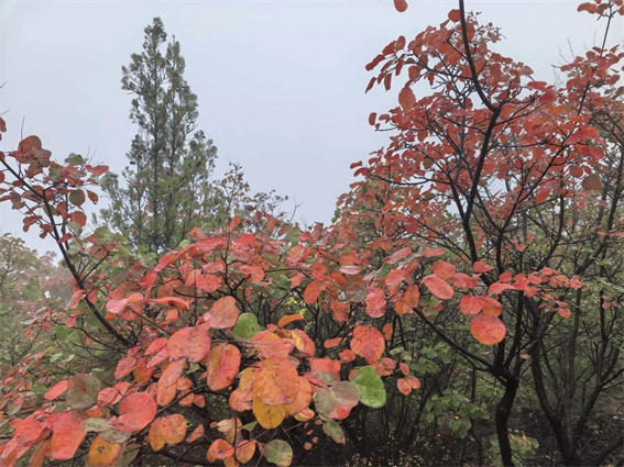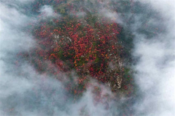 山势平缓的云梦山,是轻松赏秋的理想之地。黄栌、红枫等多个树种共同谱写秋日交响,“红叶绿中游,彩练当空舞”是这里的真实写照。站在南天门远眺,黄、红、绿交织漫山,勾勒出绝美的天际线。连绵的红叶如同大地的红毯,一直延伸到视线尽头。