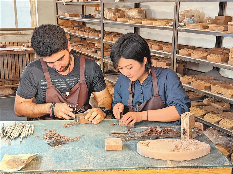 游晓晓在教外国学员做澄泥砚。 图片除署名外均为受访者供图