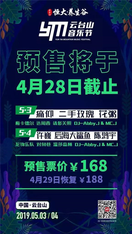 2、票务信息:云台山音乐节单日预售票168元(没有双日通票),现场售票188元。