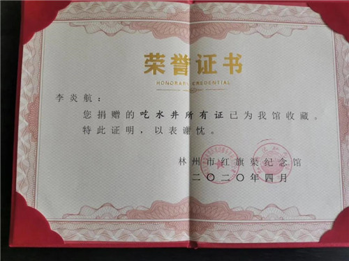 近日,红旗渠风景区接受林州爱心人士李炎航捐赠的《吃水井所有证》,在红旗渠通水55周年之际,此次爱心捐赠更是意义非凡。红旗渠风景区向捐赠者颁发荣誉证书,以表谢忱。目前,《吃水井所有证》已被红旗渠纪念馆收藏。