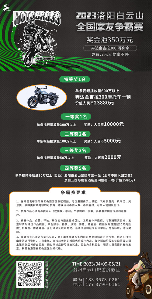 本次短视频创作活动总奖池为350万元!参与创作,最高奖励现金5万元,更有机会获得价值23880元奔达金吉拉摩托车一辆。