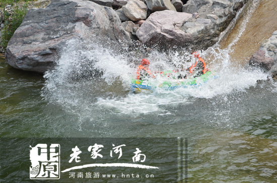 “勇士漂流段”浪花飞溅,漂流船视同飞剑,可以体验漂流的惊险和刺激。