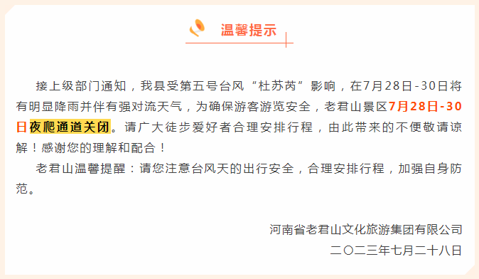 接上级部门通知,栾川县受第五号台风“杜苏芮”影响,在7月28日-30日将有明显降雨并伴有强对流天气,为确保游客游览安全,老君山景区7月28日-30日夜爬通道关闭。请广大徒步爱好者合理安排行程,由此带来的不便敬请谅解!感谢您的理解和配合! 老君山温馨提醒:请您注意台风天的出行安全,合理安排行程,加强自身防范。