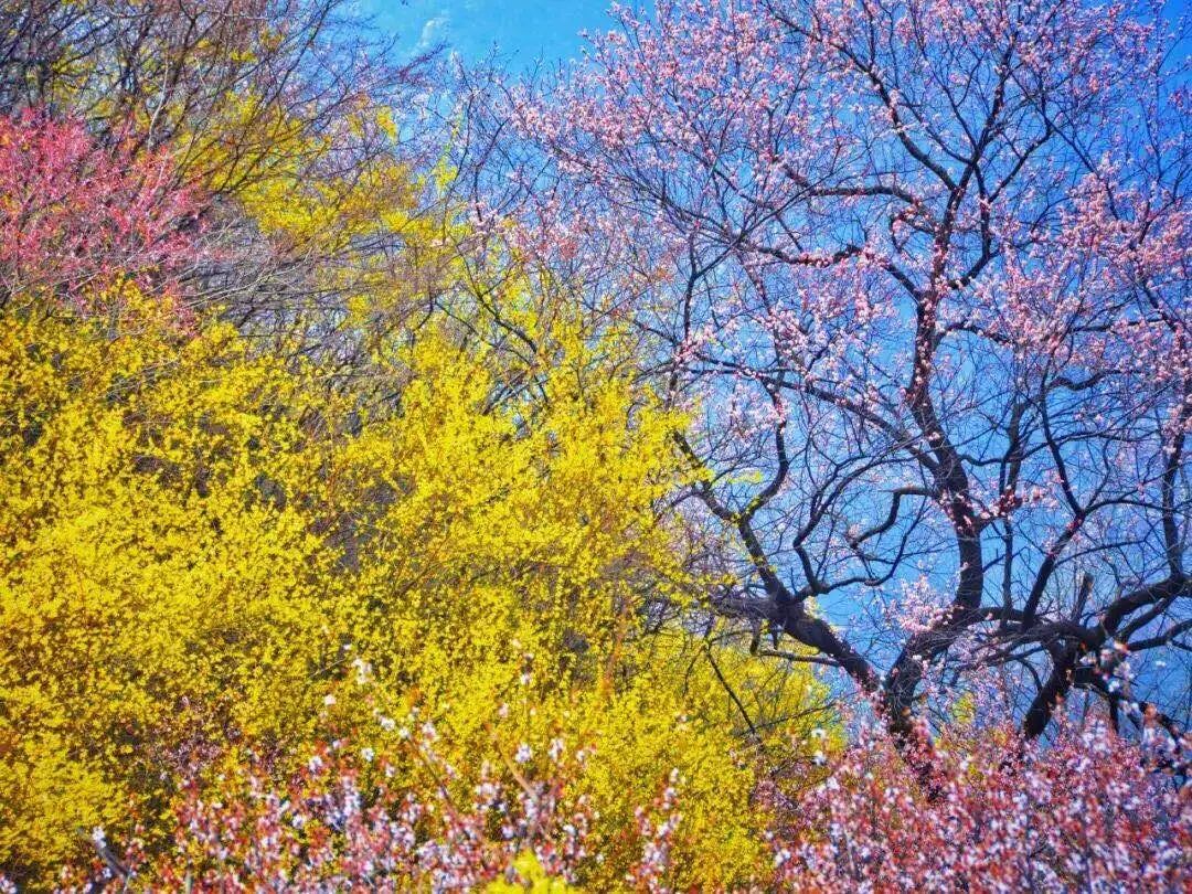 不知不觉春归来,桃红复含宿雨,柳绿更带朝烟。莺啼,柳绿,不觉万物复苏,南太行山脉春色正浓。