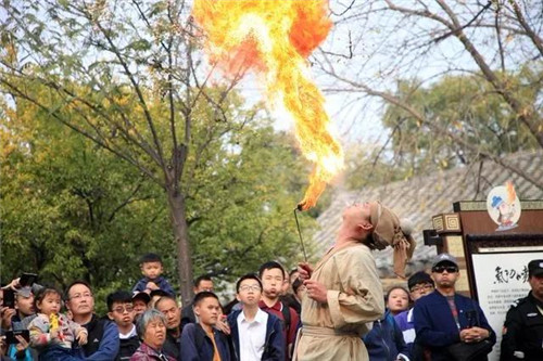 在咱们中国,有很多传统绝活绝技,让人看着就称奇的。相信很多人在一些影视剧上都见识喷火这种绝技吧?表演者手持火把,嘴对着火把吹气便有一道道火焰喷出,相当精彩。而这样的一幕,在河南开封的清明上河园景区里,天天上演着。只见一位传统喷火绝活表演者从口中吐出熊熊烈火,以火龙之势变幻出不同的烈火烟型,让现场观众们看着是叹为观止。
