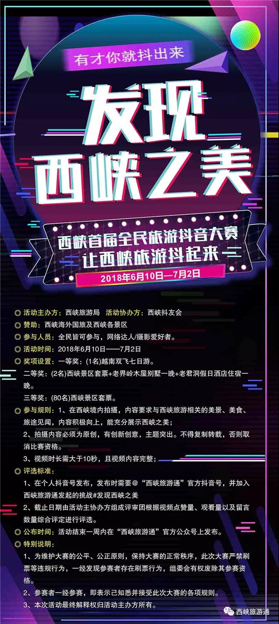 最后,“全民旅游”爱好者们,想参与“发现西峡之美”抖拍大赛,参与方式告诉你,你可以尽情打卡、刷屏啦!