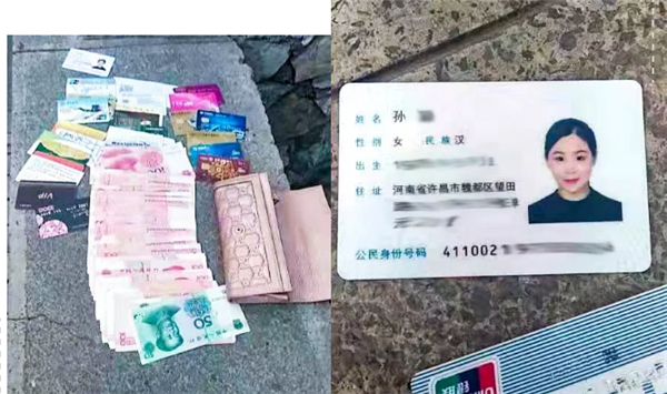 “当时我正经过小游园,发现路上有一个粉红色的钱包,打开一看竟然发现四千余元现金、若干银行卡和证件等物品。”