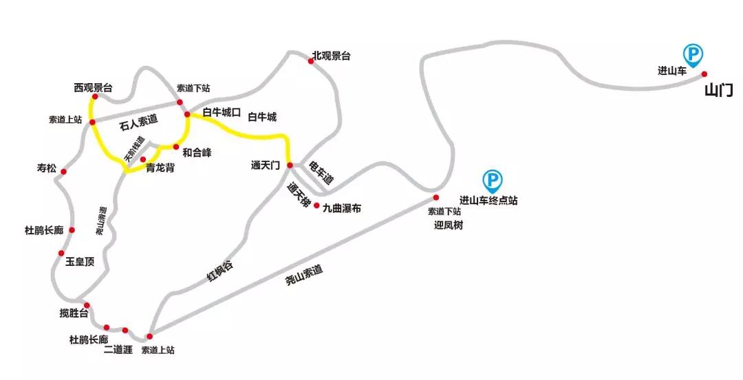 寿松——西观景台——石人索道——白牛城口——北观景台——通天门