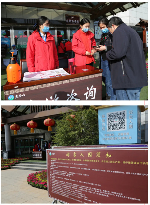 老君山景区严格按照洛阳市防疫指挥部的要求,实行了一系列的防疫措施,员工必须佩戴口罩上岗,入园游客需佩戴口罩。在景区售票处,实行无接触购票服务,游客可通过自助售票机自行购票。