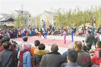 元旦当日,在竹林七贤塑像前一群孩子正在表演杂技。他们个个身怀绝技,闪展腾挪将杂技艺术展现的淋漓尽致,每一个惊险或绚丽的杂技表演环节,都让现场游客禁不住高声喝彩。