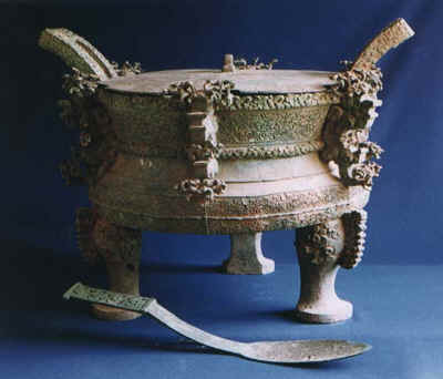 这是楚庄王之子、楚国令尹“王子午”墓中所出七件列鼎之一。鼎身为束腰平底状,侈耳、蹄足,口沿攀附6条龙形怪兽,器腹满饰半浮雕的夔纹和窃曲纹。