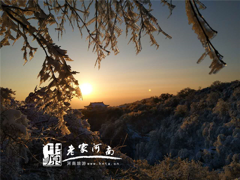 白色的雪,暖色的夕阳,如果真有天堂,便是这般模样,冰雕玉琢的栈道仿佛天宫的雕栏玉砌,山顶的狂风把枝头的雪雕塑的旖旎多姿。