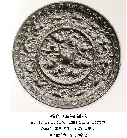 唐代是铜镜发展的鼎盛时期,海兽图案、葡萄图案的铜镜是当时铜镜的代表作。这些吸收了外来文化元素的铜镜,有很多不解之谜。瑞兽葡萄镜,又称海兽葡萄镜、海马葡萄镜。在研究洛阳铜镜的《洛镜铜华》一书中,共收录了11面瑞兽葡萄镜,有四瑞兽葡萄镜、六瑞兽葡萄镜、七瑞兽葡萄镜以及八瑞兽葡萄镜。