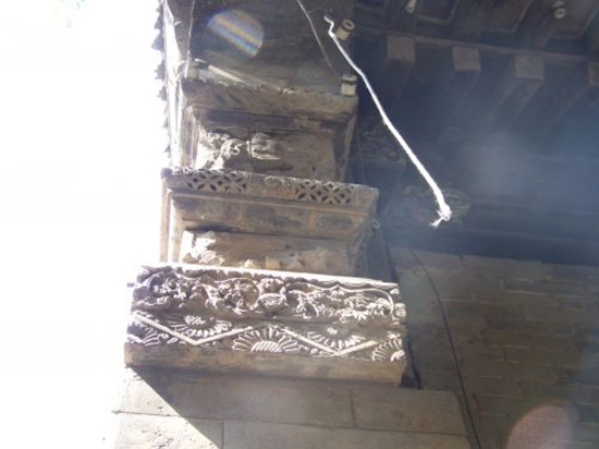 另个一处比较精美的墀头为张坊故居二进院主房上的西侧墀头,它的样式基本和山陕甘会馆的一样,都是复式的,雕工非常精美,只不过这个墀头损毁相对严重,两个束腰部分均已毁坏,看不清雕的是何物件。但角石仍在,雕工出神入化。
