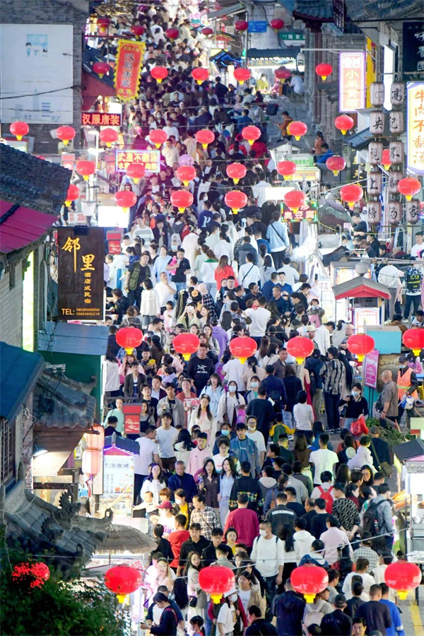 和老城十字街连在一起的丽景门是洛阳第一楼,有「中原第一门」的美誉,每到夜晚也格外惊艳。进入城门,巍峨雄伟的古城和吆喝叫卖的店铺沿街而立,古老和市井在这里完美交汇,碰撞出了一份古朴的烟火气。