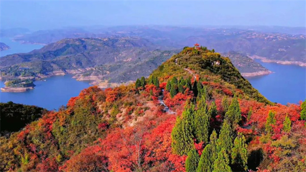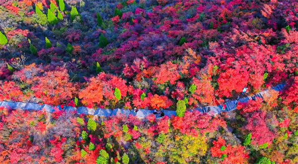 而每至深秋时节,更是红叶满谷,娇艳如锦,沿着山脊,顺着山坡,在蓝天白云下,在山谷溪流旁,形成一幅五彩斑斓的画卷。