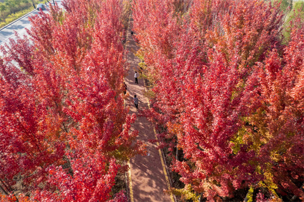在中央公园万通街儿童游乐园南侧,800余株美国红枫的叶子由绿变红,漫步在中央公园的林荫小路,可谓色彩醉人。